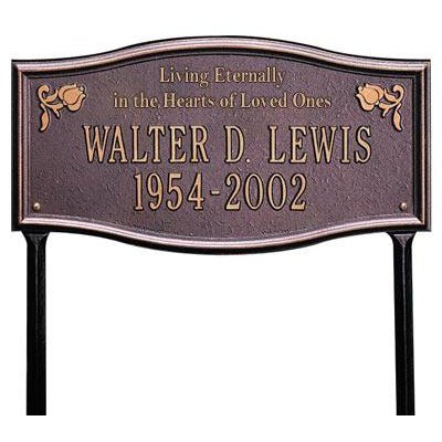 Our memorial garden plaques measure 17" X 9" and are made of cast aluminum. (18" stakes included). These custom memorial plaques are available with your choice of two plaque texts, plus your own two lines of personalized text. We guarantee these markers to be created as ordered (correct spelling, dates, etc). We will accept exchanges on defective custom products.
