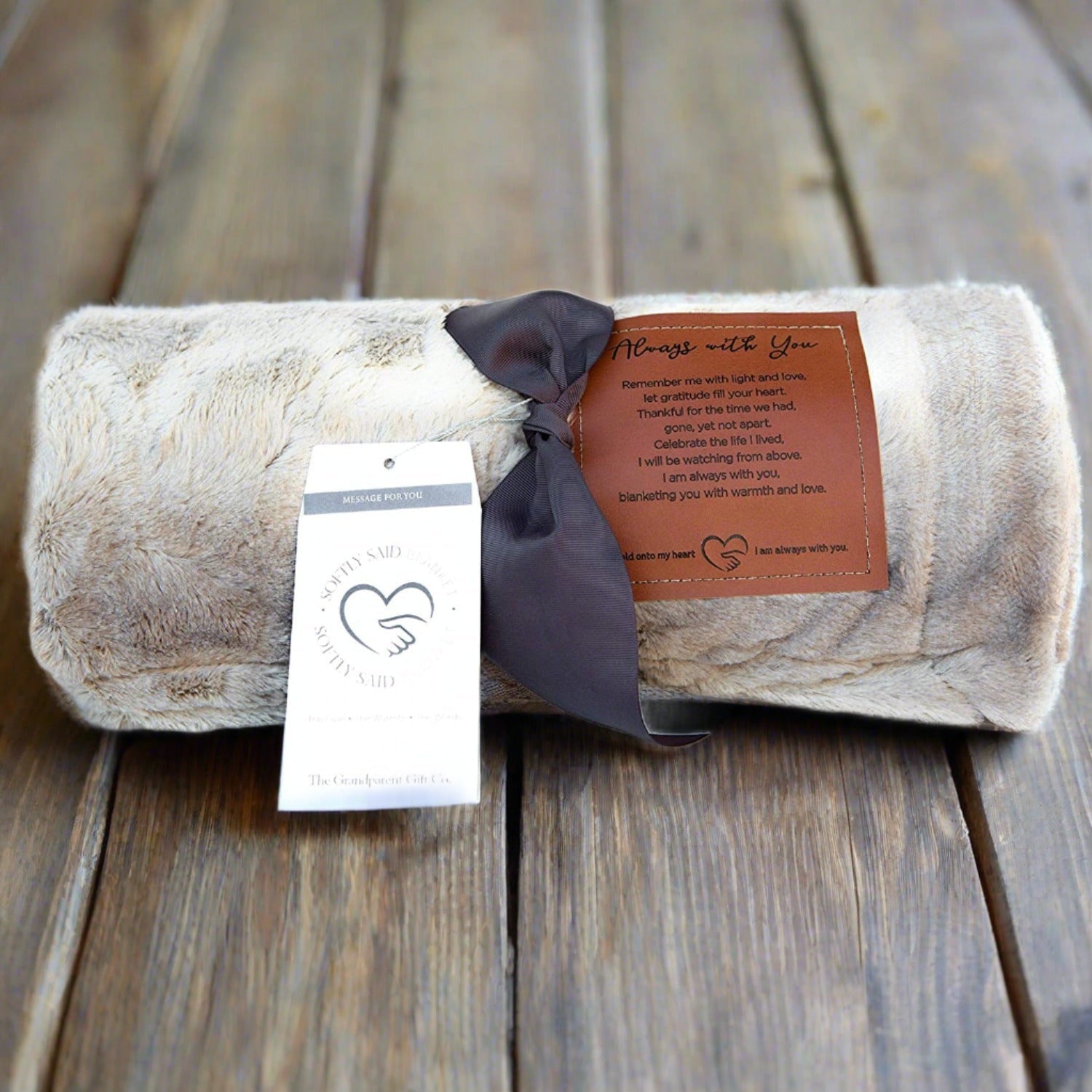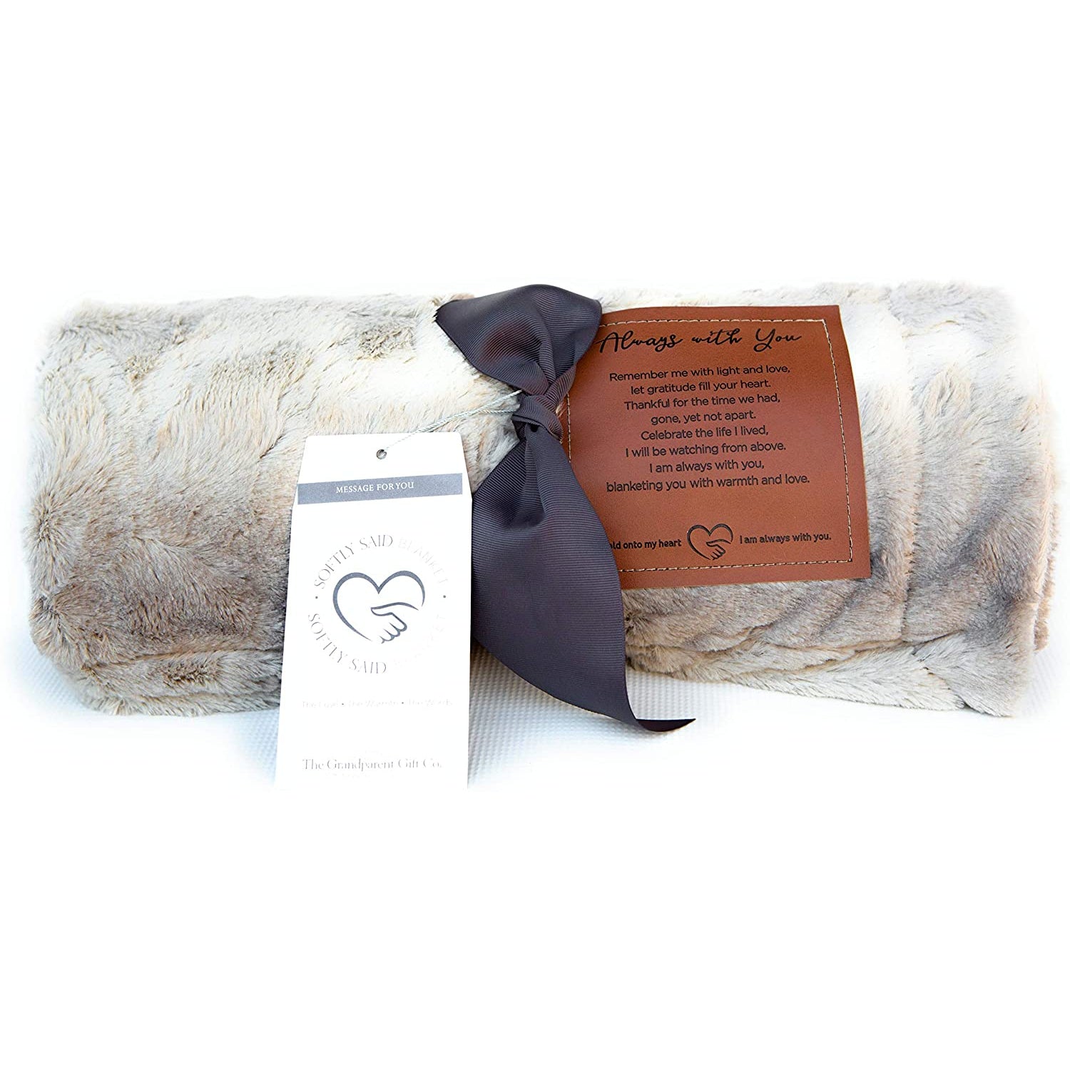Our Softly Said “Always with You” comfort blanket measures 50 × 60 inches and is designed to wrap someone in warmth during difficult seasons. Made from ultra-soft faux fur and micro mink fleece in a calming gray tone, it offers gentle, everyday comfort for body and spirit.