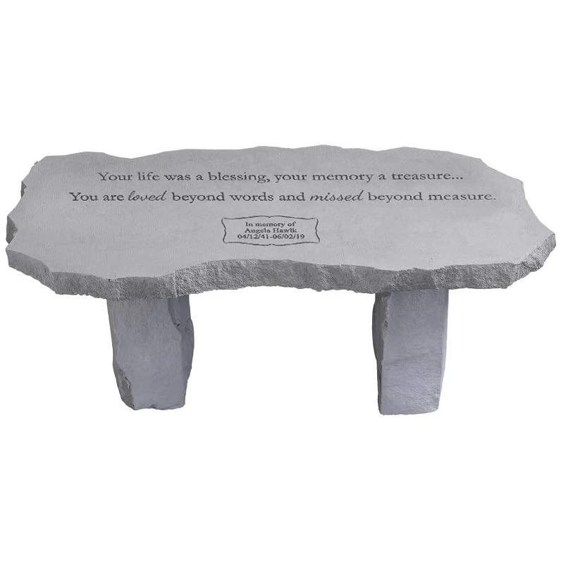 This unique sympathy gift is handmade in the USA. Made of stone cast concrete, each piece has the look, feel and weight of true stone. This item includes FREE personalization and FREE shipping. Bench arrives in two packages: benchtop and legs. Very light assembly is required.